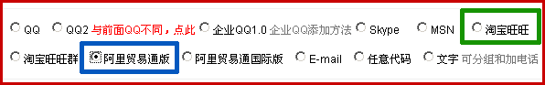 如下图,错误选择了蓝色框里的“阿里贸易通”,而应该选择绿色框所示位置的“淘宝旺旺”。请登陆会员中心修改客服。